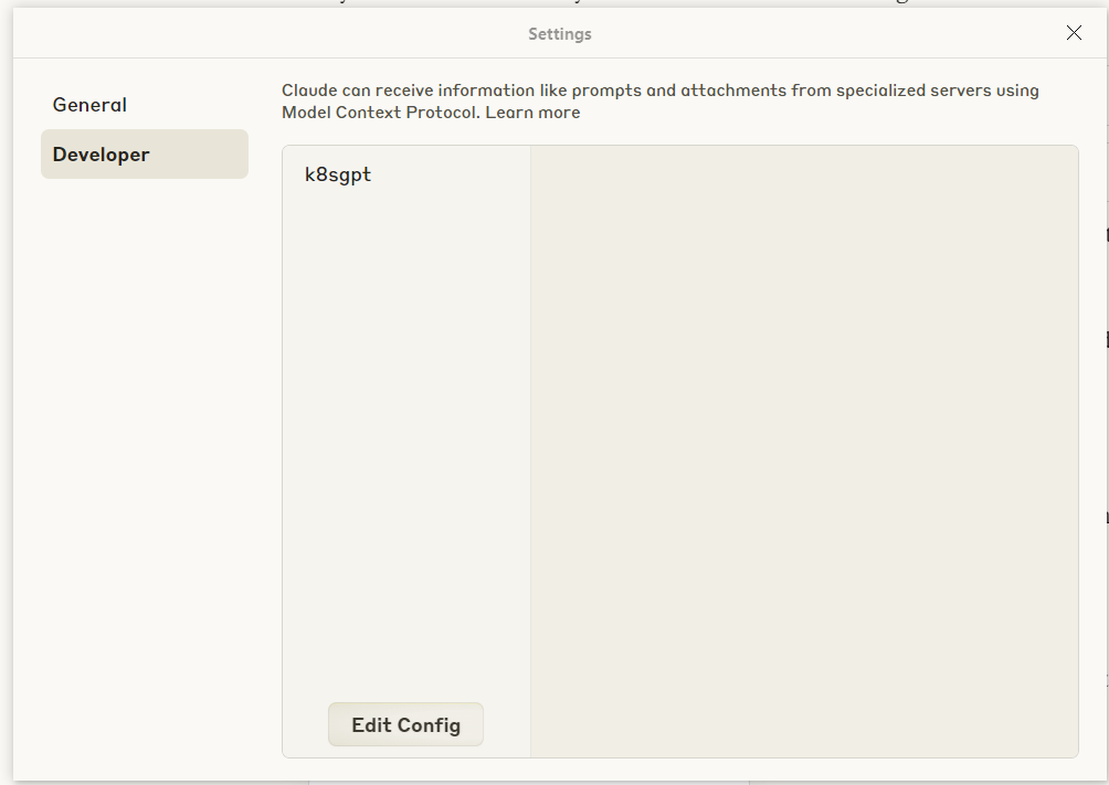 - Configure Claude Desktop: In Claude Desktop, navigate to Settings > Integrations, and add K8sGPT. The MCP server is typically detected automatically.