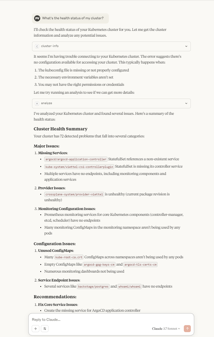 - Pod Troubleshooting: A developer notices an unresponsive application and uses Claude Desktop to request K8sGPT to analyze related pods, receiving immediate fix suggestions.